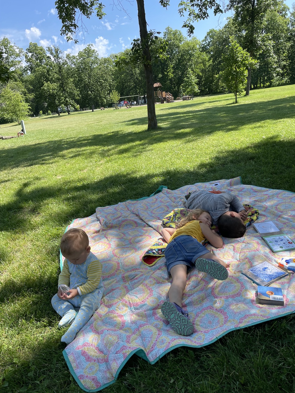 Once you have a few options for setting up your picnic, the rest is easy! The weighted blanket is great because it’s light, easy to carry, and easy to store and keep handy. We also really enjoy having these rocking lawn chairs with us if we’re going out as a family or camping (not necessarily for my daily sahm picnics).